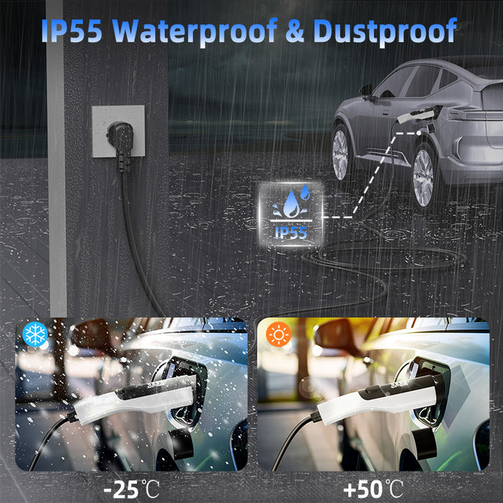 - Impermeabile e Antipolvere IP55: Costruito con una scocca resistente, il nostro **caricabatterie VE mobile con certificazione IP55** resiste a diverse condizioni climatiche europee. Funziona perfettamente da -25℃ a 50℃, affidabile in ogni clima.